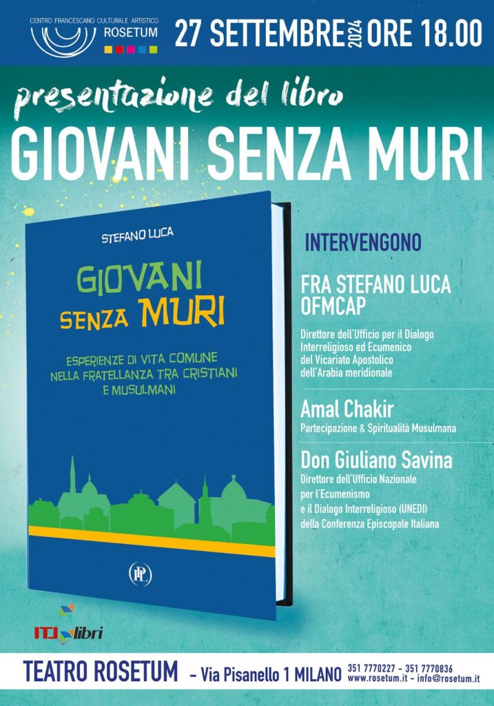 Oggi, venerdì 27 settembre alle ore 18.00 al Teatro Rosetum (via Pisanello 1, Milano) ci sarà la presentazione del libro “GIOVANI SENZA MURI”, di fra Stefano Luca.