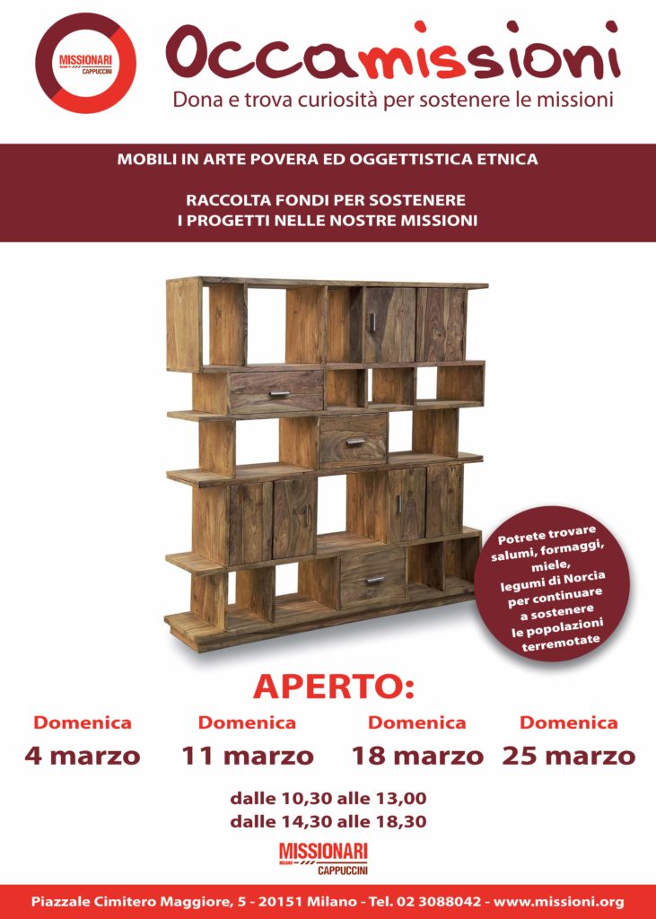 Troverete mobili in arte povera e oggettistica etica, come raccolta fondi per sostenere i progetti delle nostre missioni. Continua la solidarietà a favore delle popolazioni terremotate del centro Italia con la vendita delle specialità tipiche della Valnerina, quali salumi, formaggi, miele, biscotti e legumi provenienti delle aziende agricole di quest’area che sono state gravemente colpite dal terremoto.